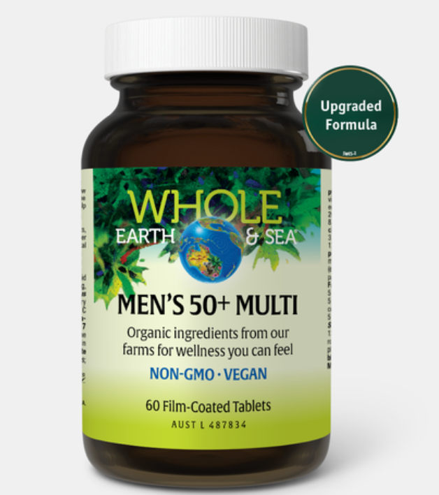 Men’s 50+ Multi contains numerous vitamins and minerals sourced from fresh, raw plants, whole sea vegetables, cruciferous sprouts, fruits and herbs to support the health and wellbeing of men over 50. The nutrients in this versatile multivitamin help maintain heart and bone health, as well as cognitive function.